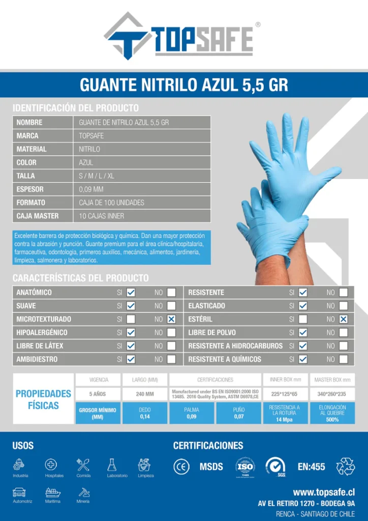Guantes de examinación nitrilo azul, formula suave y delgada otorga mejor tacto y sensitividad a palma y dedo. Los guantes de nitrilo son los más resistentes y protectores contra productos abrasivos, químicos e infecciosos.